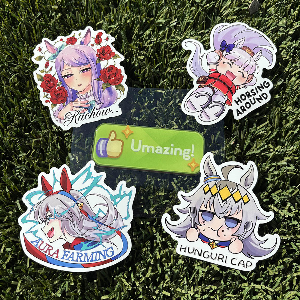 We make a variety of merchandise: charms, standees, buttons, stickers, and stickersheets! We use Photoshop, Clip Studio Paint, and Procreate. Some of these are handmade using Silhouette Cameo and a button maker.